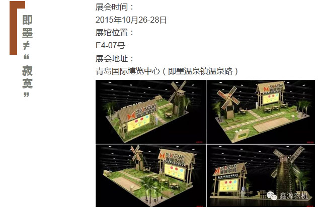 備受矚目的“世界知名,亞洲第一”《中國(guó)國(guó)際農(nóng)業(yè)機(jī)械展覽會(huì)》將于2015年10月26日至28日在青島國(guó)際博覽中心舉行。