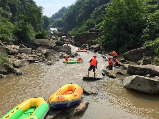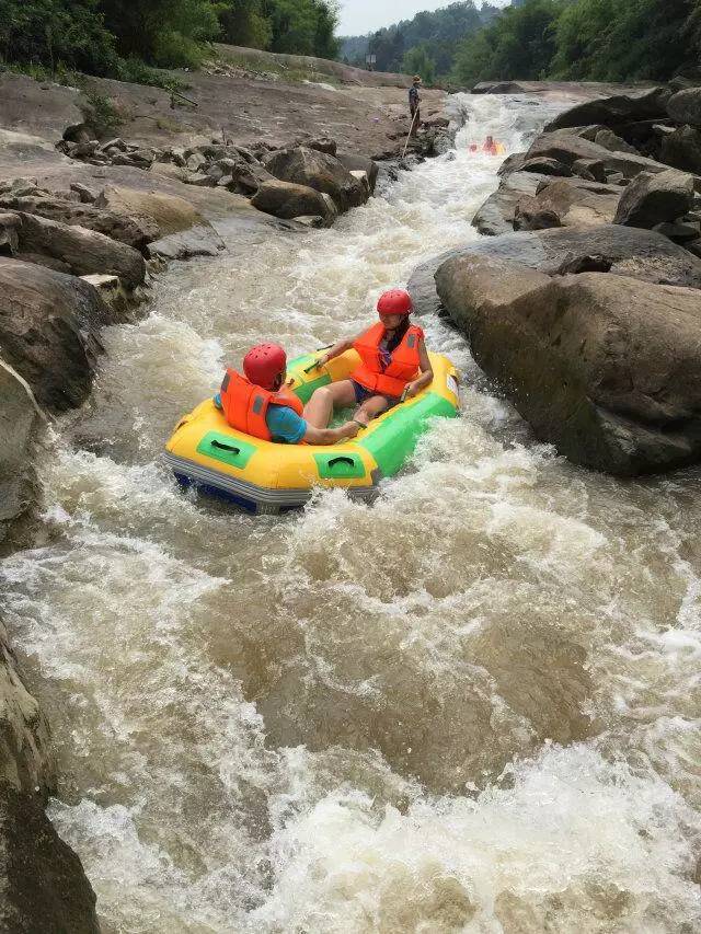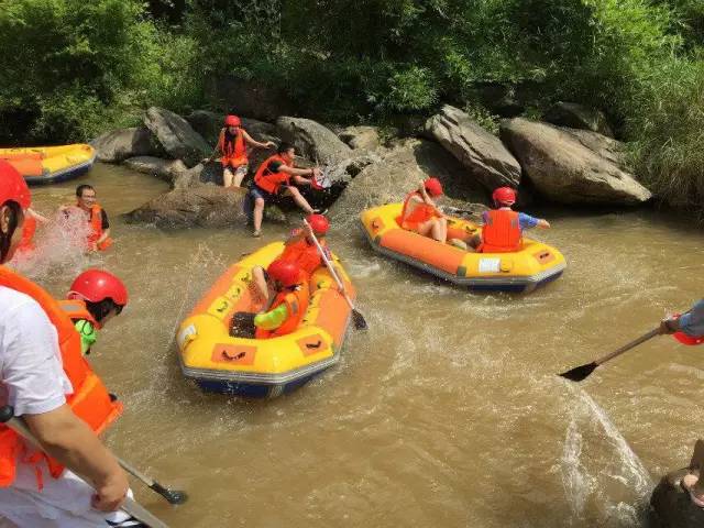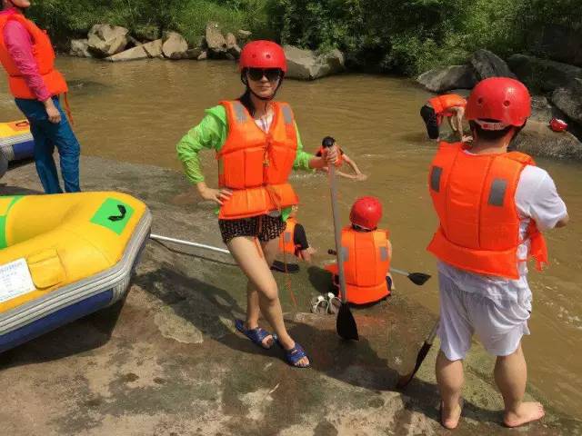 第二天,激情漂流開始了。組辦方也是頗費心思,一男一女搭配乘坐一艏船,戴上安全帽,穿上救生衣,拿著船槳,出發了。最高18米的落差,一個急速俯沖,各種驚聲尖叫層出不窮、連續不斷。漂流途中更是刺激無比,一不小心就會遭遇埋伏,請多人拿著頭盔、漿、瓢、盆各種武器,冰涼的河水鋪面而來,潑水的人笑哈哈,被潑的人哇哇叫,被潑得分不清東南西北。各種潑水,各種翻船,輪番上演,大家玩得不亦樂乎。