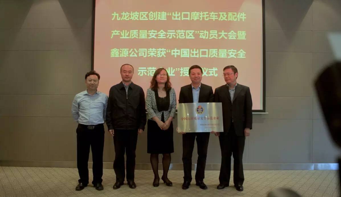 鑫源摩托作為重慶市九龍坡區代表企業, 4月29日,九龍坡區創建“出口摩托車及配件產業質量安全示范區”動員大會暨鑫源摩托榮獲“中國出口質量安全示范企業”授牌儀式在鑫源工業園舉行。國家質檢總局檢驗監管司處長劉慧娟、重慶市檢疫檢驗局副局長陳開茂、九龍坡區政府區長石繼東、高新區管委會副主任趙文明等領導出席會議。