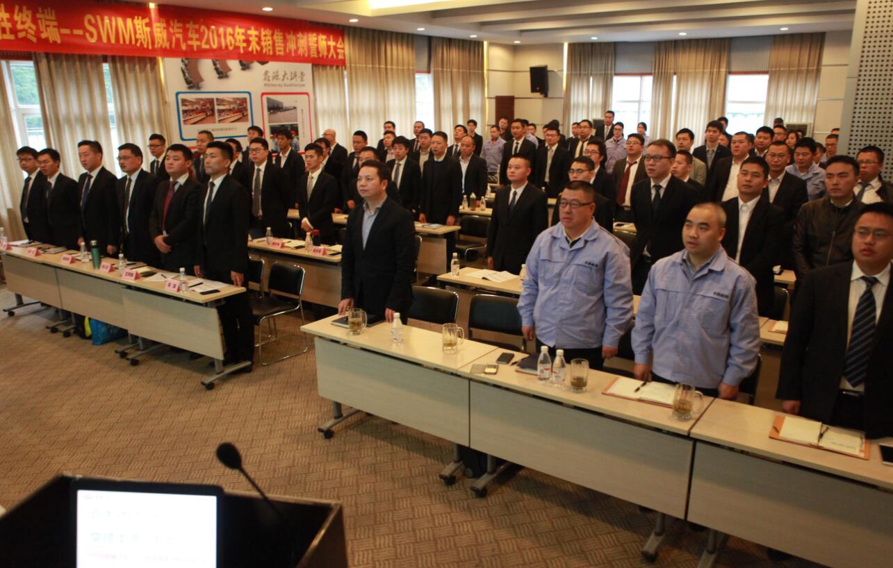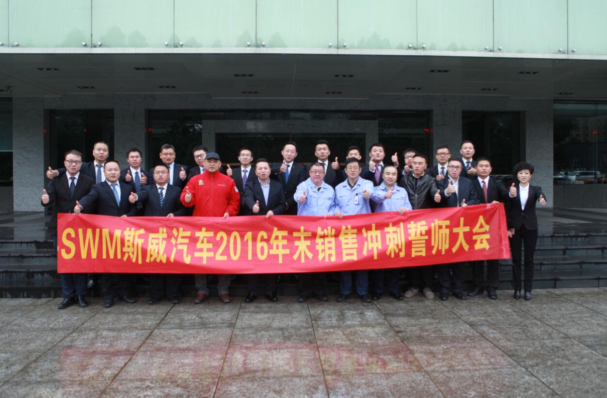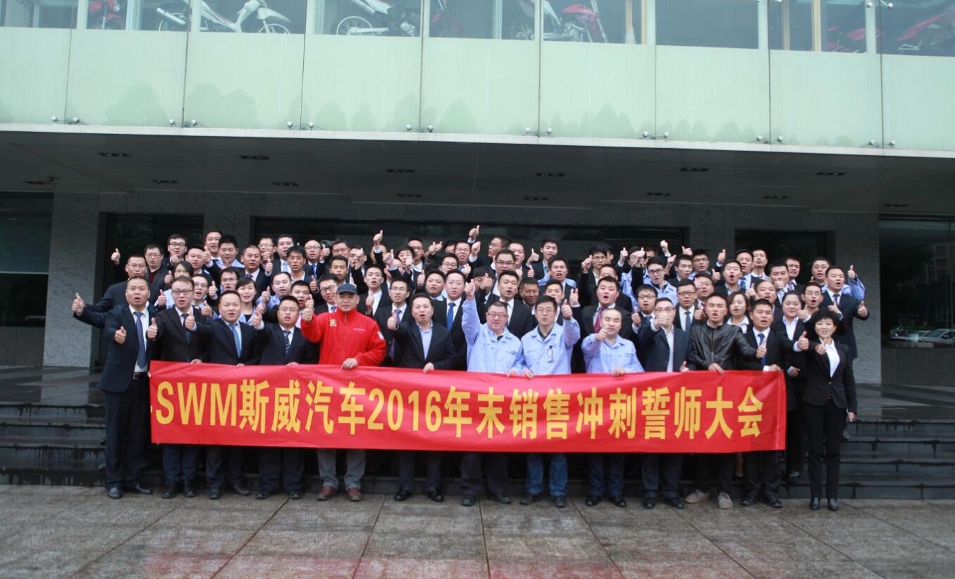 2016年的腳步已接近尾聲,斯威人為了年度目標而沖刺,人人責無旁貸。2016年10月29日,SWM斯威汽車2016年末銷售沖刺誓師大會暨11月、12月渠道開發(fā)目標、啟票目標責任書簽訂儀式在含谷生產基地隆重召開。