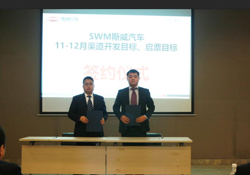 鑫源控股副總裁兼銷售公司總經理張洪巖與SWM斯威品牌事業(yè)部品牌總監(jiān)助理白松簽訂目標責任書