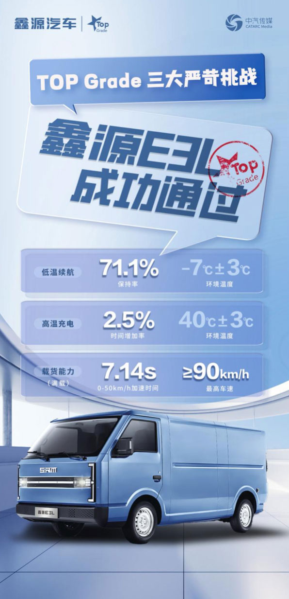 鑫源E3L在由行業權威機構——中汽中心舉行的“2024Top Grade頂級品質挑戰”極限測試中,在嚴苛的測試條件下成功通過“低溫續航、高溫充電和載貨能力”三種工況測試并取得優異成績。鑫源E3L在低溫續航保持續率、高溫充電時間及滿載加速的多項測試中,均取得優異的成績,這不僅得益于鑫源E3L優異的性能,也是搭載新一代寧德時代電池的出色表現。