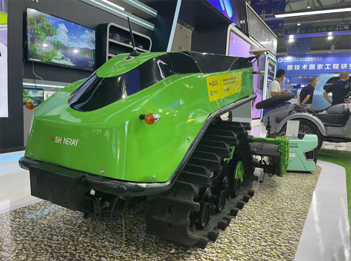 本次智博會鑫源新能源農機展出的產品是自走履帶旋耕機,它采用了無極變速電機以及納米硅鋰電池,續航能力。