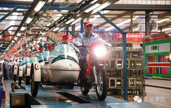 2015年3月30日,萬眾期待的鑫源復(fù)古邊三輪(挎子,XY400B)頭戴大紅花,在鑫源摩托生產(chǎn)車間生產(chǎn)三線隆重下線。鑫源摩托公司總經(jīng)理鐘秉福先生、國內(nèi)營銷部總經(jīng)理余波等高層領(lǐng)導(dǎo)、研發(fā)團(tuán)隊(duì)以及生產(chǎn)團(tuán)隊(duì)出席了本次下線儀式。